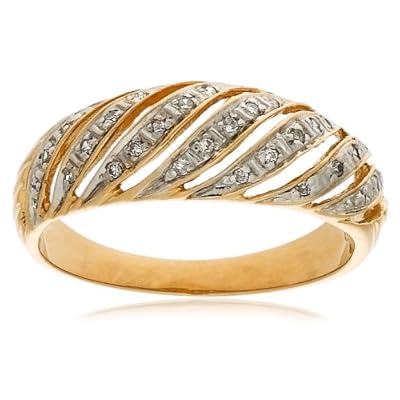 This unique contemporary ring shines in two-tone 10 karat gold with genuine diamond accents. The yellow gold ring has a slight domed shape with diagonal cut-outs across the top. Between the cut-outs are diagonal bands featuring petite round diamonds set in white gold. The 25 single-cut diamonds are near colorless and have a total weight of .08 carat and a minimum clarity of I2-I3.10k Two-Tone Gold Diamond Ring (.08 cttw, G-I Color, I2-I3 Clarity), Size 7