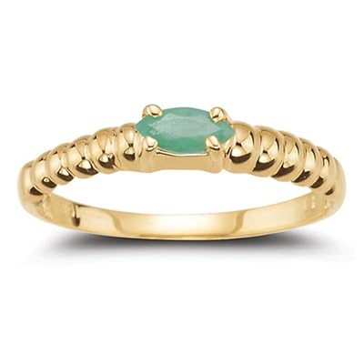 Simple elegance defines this emerald marquise ring, fashioned from polished 10 karat yellow gold. A single marquise-shaped emerald, with an opaque grass green color, is centered horizontally on top of a slender gold band. Rounded ridges carved into the top of the band lend added texture and interest to the design. Emerald is the birthstone for the month of may May. It's captivating green color suggests spiritedness and joy as well as harmony and love of nature.