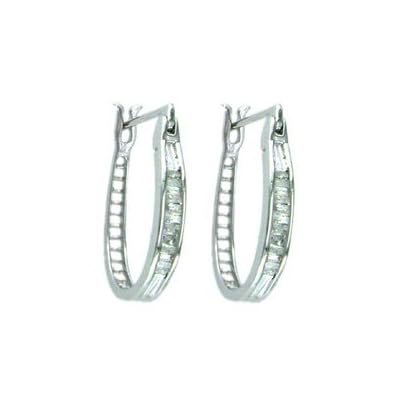 These impressive Diamond Hoop Earrings feature a 1/4ctw of blazing diamonds. The baguette cut stones are channel set in with alternating round and baguette cuts set in 14K white gold. Handcrafted with hinge post and catch backing for pierced ears."