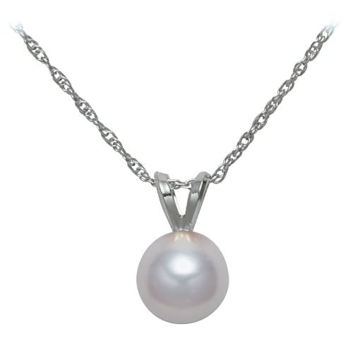 This graceful cultured pearl pendant features a round freshwater cultured pearl with a lovely white color. It is fastened to a 14k gold V-shaped bale and hangs from a delicate 14k gold rope chain with a spring ring clasp. The pearl falls just below the throat, and though it is delicate and small, it truly shines in this simple and elegant setting.14k White Gold Freshwater Cultured Pearl 6.0-6.5mm Pendant, 18"