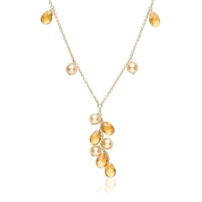 Golden pearls and orange citrine stones pair beautifully in this elegant drop necklace, crafted from 14 karat yellow gold. The gemstones and pearls are stationed along the length of the chain and clustered in an elegant dangle at the chain's base. Their champagne hues blend perfectly with the warm gleam of the yellow gold.14k Yellow Gold Citrine & Freshwater Cultured Golden Pearl Necklace