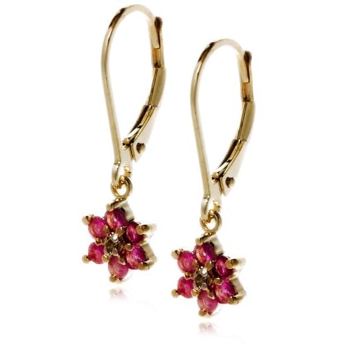 Six petite round rubies frame a single diamond accent in these delicate floral earrings, crafted from genuine sterling silver with an 18 karat yellow gold overlay. The stones have an opaque pink-red color and are held securely in prong settings. The petite flowers dangle from curved posts, and the earrings are secured with comfortable leverback closures. Ruby, the red variety of the mineral corundum, is often given as a symbol of love or passion.