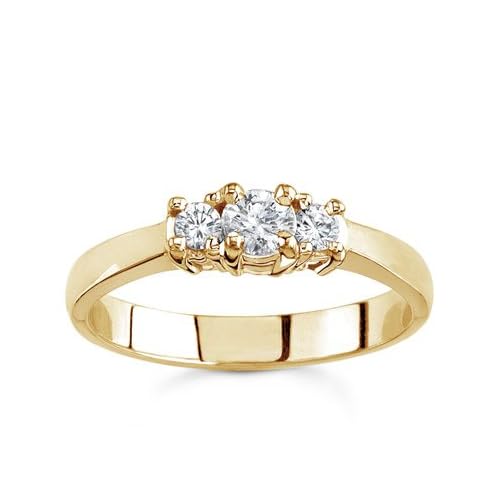 Sparkle and dazzle her forever with this classic three-stone ring beautifully displaying three brilliant round diamonds set in 18k yellow gold. Total diamond weight is 1/4 carat (G/VS2).