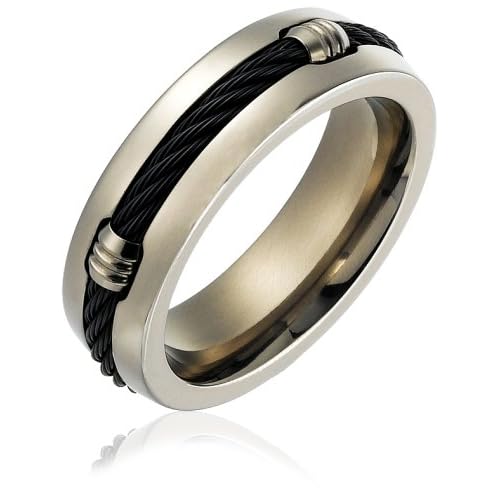 This 7 millimeter wedding band is a modern and unique choice in gleaming polished titanium. The band has a slightly domed shape with squared edges and a rich, dark polished silver color. The centerpiece of the design is a black rope-textured titanium inlay, accented with four barrel-shaped pieces.