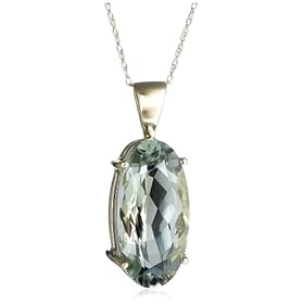 A single oval-shaped green amethyst stone shines in a 10 karat yellow gold setting in this alluring pendant. The prong-set stone has a delicate light green color and a beautiful faceted cut that gives it great depth and sparkle. It's held in a four-prong setting with an open back that allows light to filter through the facets. Detail
